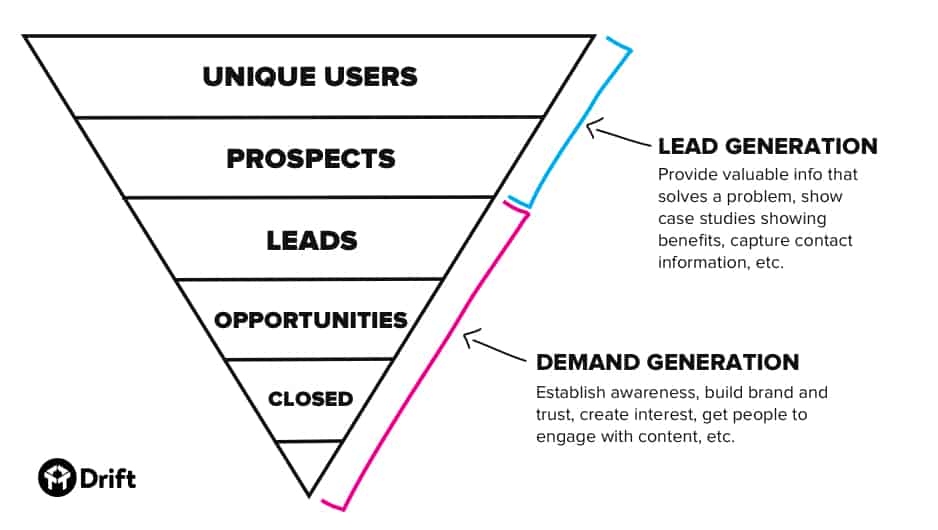 Let’s use Drift’s visual interpretation of how these two play together. According to Drift, lead generation is a subcategory of demand generation.