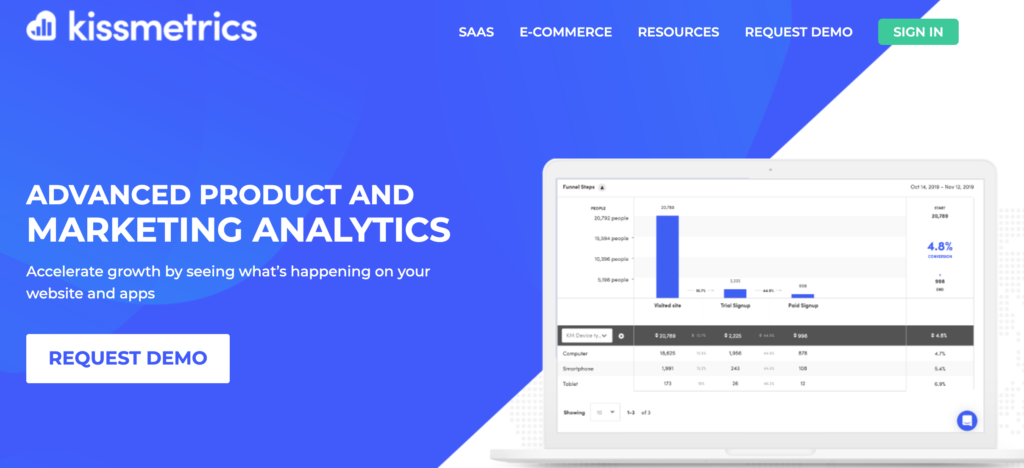 Often seen a Google Analytics alternative, KissMetrics is a website analytics tool focused on tracking data from your visitors’ behavior and history. The tool has become handy for merchants, as it helps track events on every touchpoint and provide an online shoppers’ funnel analysis. KissMetrics allows to accumulate all information about the visitor—see the resemblance with Google Analytics? The tool also offers segmentation, A/B testing, reporting, and staging sandboxes.